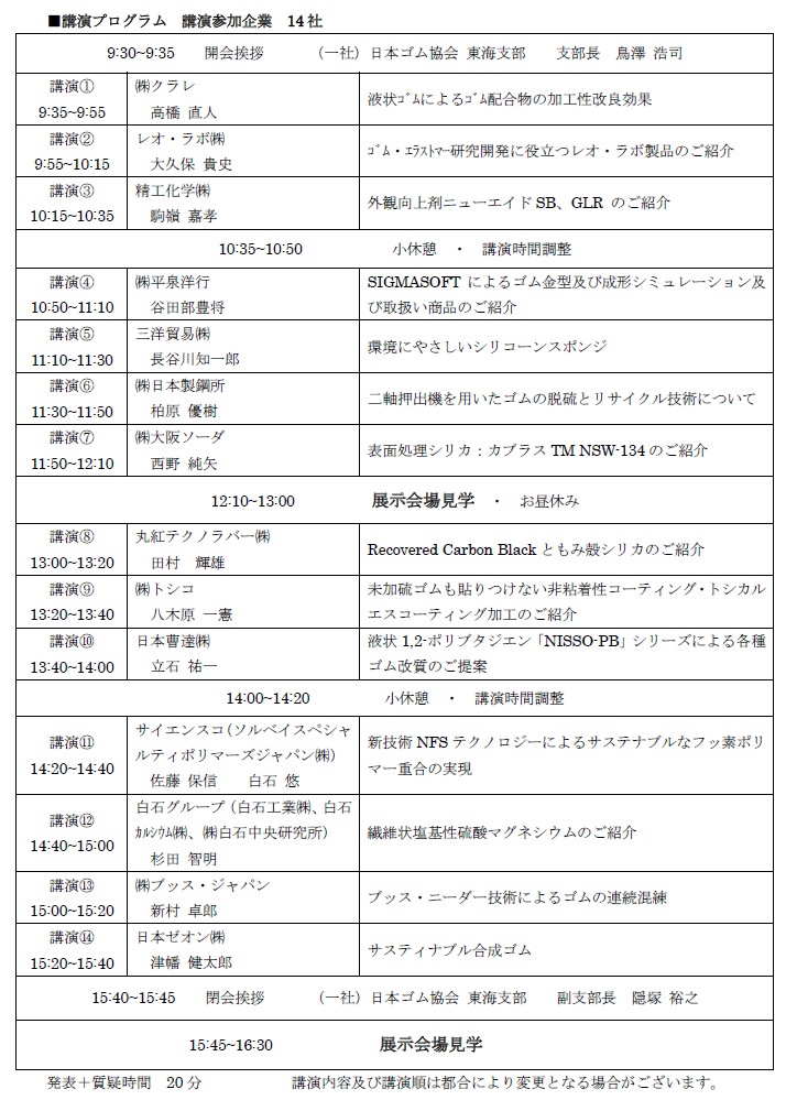 今年も日本ゴム協会東海支部主催の総合紹介講演会に参加致します。