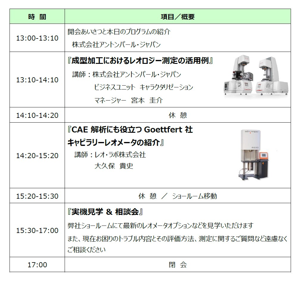更に、アントンパール社ショールームにて最新のレオメータオプションだけでなく、各種分析装置を紹介し、皆様が実務においてお困りの点などの相談会を実施します。
