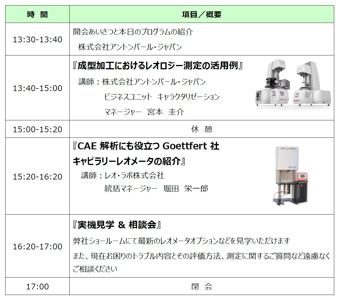 更に、アントンパール社ショールームにて最新のレオメータオプションなどを紹介し、皆様が実務においてお困りの点などの相談会を実施します。
