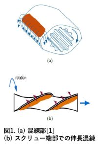 スクリュー側面上での混合により伸長混合が発生します。(図1-(b))ただし、これは溶融物のごく一部でのみ適用されます。新設計のスクリュー形状では、分散混合をさらに強化するために、新しい要素が組み込まれ伸長変形をより促進することで、溶融物の分散混合が改善しました。