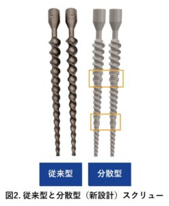 この研究では、連続混練条件下で従来のスクリューと新設計(分散型)スクリューの混合効率を比較しました(図2)。混合に関する2つの重要な指標として、滞留時間と混練の質(粒子径の減少と均一性)に焦点を当てました。混練の質が高いということは、粒子が適切なせん断レベルで効果的に分散できることを意味し、その結果、粒子の表面積が増加することに注目する人もいます。
