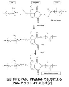 PP/PA6の相容性を実現するために、無水マレイン酸グラフトPP(PP-g-MA)を相容化剤(乳化剤)として使用しました。PP-g-MAは両方のポリマー界面に優先的に存在し、無水物基とポリアミド末端の化学結合を通じて(図3)、同時にPP相との熱力学的相容性を維持することで界面張力が減少し、より良好で安定したブレンド形態が得られます。