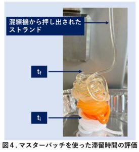 実験1では、LDPE/LDPEマスターバッチを使って連続混練を行い、従来型と分散型スクリューの滞留時間を比較しました。LDPE(MFI 10g/10min)を自動試料投入フィーダーを使用し、10g/minの供給速度でMC40へ投入します。スクリュー回転数は50または100rpm、バレル温度は200℃に設定しました。循環バルブは開いた状態にし、ワンパスで連続混練を行いました。定常状態になったタイミングで、0.07gの着色したマスターバッチをMC40に供給し滞留時間を評価しました。(図4.ti:色が現れる時間、tf:色が消える時間)