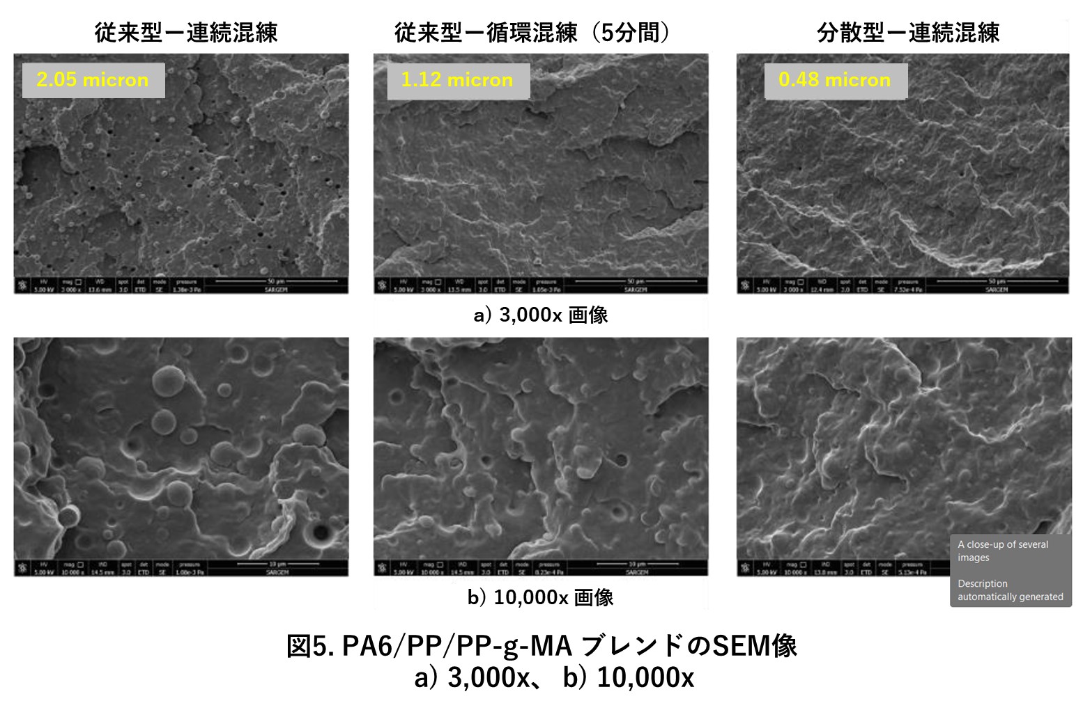 後半では、従来型スクリューと分散型スクリューの混練の質を比較しました。図5はPA6/PP/PP-g-MAブレンドのSEM像です。PPはマトリックス、PA6は分散相であり、明らかに粒子として確認できます。分散型スクリューを使用すると、PA6の平均分散粒子サイズが従来型スクリューの2.05μmから0.45μmに減少しました。分散型スクリューにより、ドメインサイズが減少し、PPマトリックス内でのPA相の分散の均一性と均質性が向上しました。