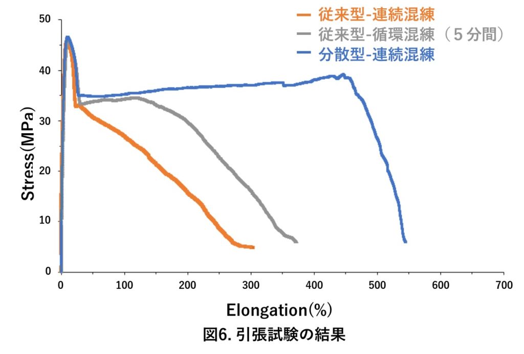 図6は引張試験の結果です。各ブレンドの破断伸びは「分散型-連続混練」>「従来型-循環混練」>「従来型-連続混練」の順番でした。この結果は、SEM画像の平均粒径の結果とよく相関がとれています。分散型スクリューを用いた連続混練により、最小の粒子サイズと最高の破断伸びが得られます。言い換えると、粒子サイズが小さいほど早い段階の破断を防ぐことができます。基本的に界面現象(界面強化)と併せて粒子サイズが小さいほど、界面の表面積が大きくなるため破断伸びが大きくなると結論付けることができます。