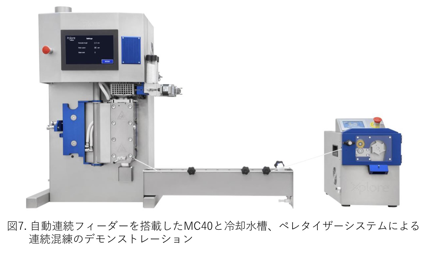 ポリマーを連続混練して良好な分散と分配を達成するために、2つの重要なパラメータがあります。1つは混練中に適切なせん断変形と伸長変形を行うことです、もう1つは変形下での十分な滞留時間です。特定の混練システムに適したスクリュー設計によりこれら2つの重要な要素に対応することができます。今回の研究では、MC40で確立されている循環混練に加えて、新設計の分散型スクリューを使用することを実証しました。新設計スクリューによりポリマーコンパウンドの少量の混練処理(顆粒状、フレーク状及び粉体などかさ密度に応じて1時間当たり約250g~3.0kgの処理)を連続混練で行うことも可能です。さらに、図7に示すようにMC40とウォーターバス、ペレタイザーを組み合わせて、連続してペレット化するシステムとして運用することも可能となります。